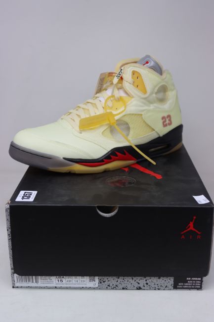 A pair of as new Nike X Off White Air Jordan 5 Retro SP "Off-White - Sail" sneakers (UK 14).
