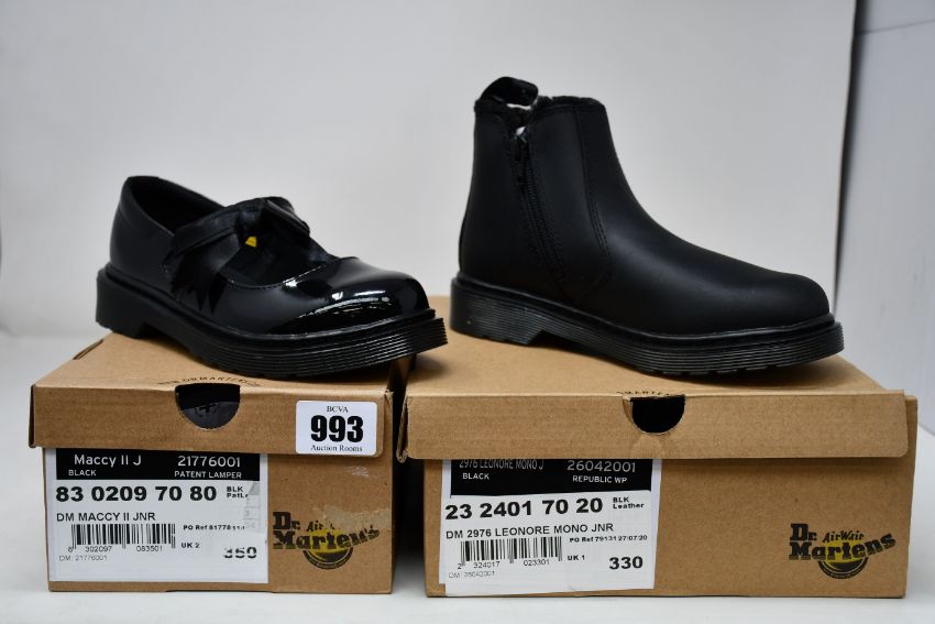 Two pairs of children's as new Dr Martens footwear; Leonore Mono (UK 1) and Maccy II (UK 2).