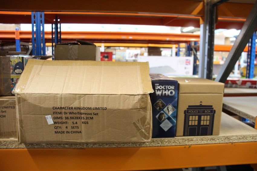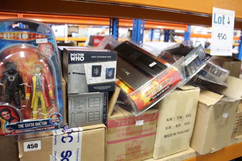 A quantity of Doctor Who merchandise to include mugs, posters, action figures and desk tidy.