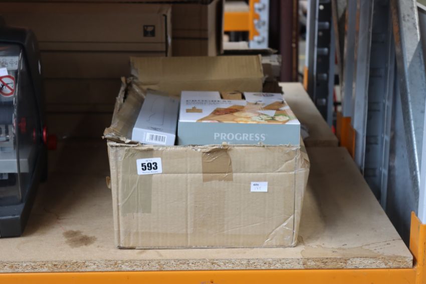 Six boxed as new Broggi kitchen knives to include a 20cm chefs knife, 11cm utility knife, 7.5cm paring knife and a Progress bamboo 3 piece paddle chopping board set.