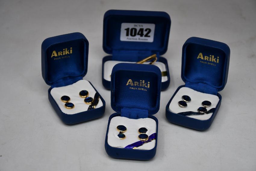 Two 22 carat gold plate Paua ablone shell shirt stud sets (Four per set), a set of palladium plate Paua abalone shell shirt stud set (Four per set) and a 22 carat gold plate Paua abalone shell tie pin.