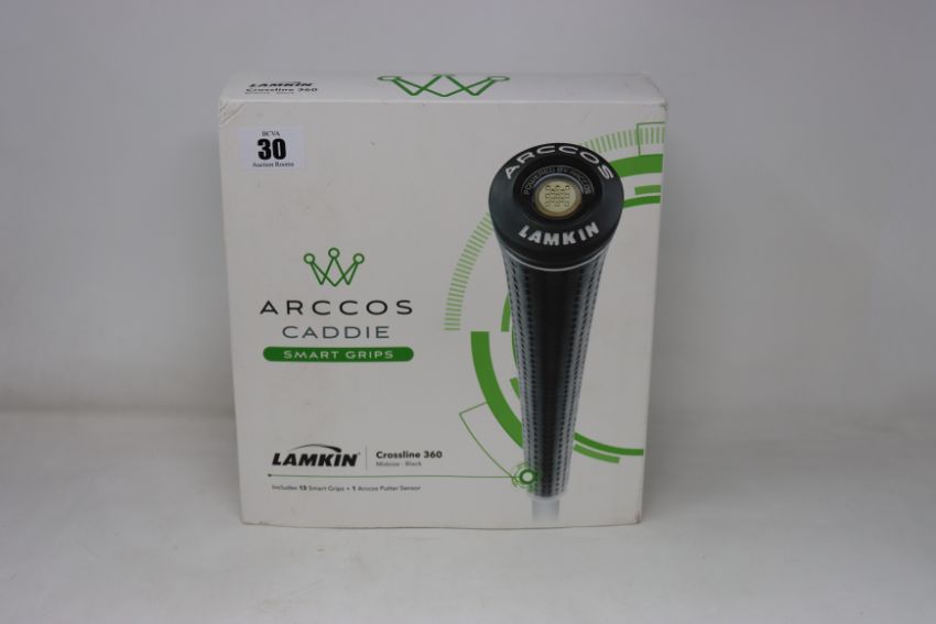 A boxed as new Lamkin Arccos Caddie Smart Grips - Crossline 360, Midsize - Black (13 Smart Grips and 1 Arccos Putter Sensor).