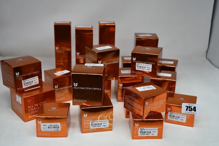 Nine Mizon Multi Function Formula all in one snail repair cream (9 x 75ml), three Mizon Multi Function Formula snail wrinkle care sleeping pack (3 x 80ml), five Mizon snail repair eye cream (5 x 25ml), three Mizon Multi Function Formula snail repair intensive toners (3 x 100ml) and one Mizon Multi Function all in one snail repair cream (120ml).
