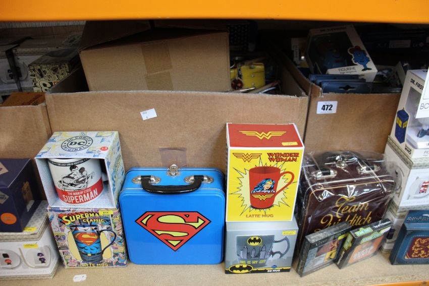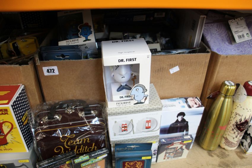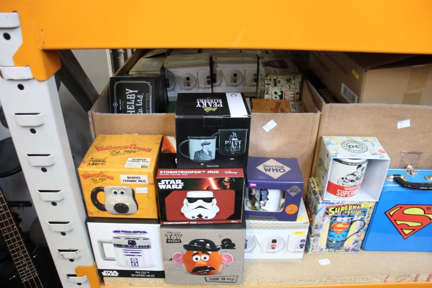 Assorted as new British film/TV novelties to include mugs, coasters, lunchboxes and games from franchises such as Peaky Blinders, Star Wars, Doctor Who, Wallace and Gromit and Toy Story.