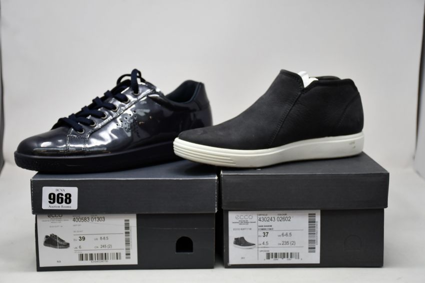Two pairs of women's as new Ecco trainers; Ecco Soft 1 (UK 6) and Ecco Soft 7 (UK 4.5).