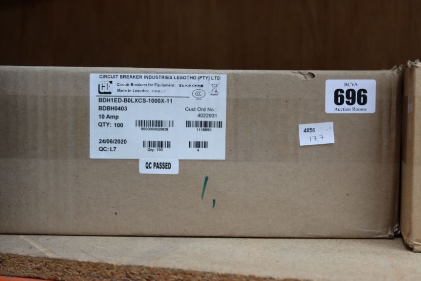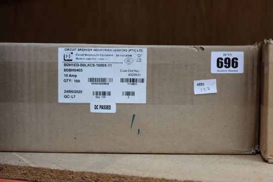 A large quantity of CBI B-frame 10 amp circuit breakers BDH1ED-B0LXCS (Approximately 100 items per box).