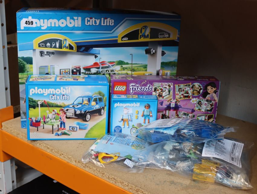 An as new Playmobil City Life petrol station 168pc, one as new Playmobil City Life grooming parlour, one as new Playmobil City Life 20pc boy in a wheelchair, five bags of assorted Playmobil and one boxed as new Lego Friends cafe.
