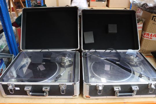 Two pre-owned Technics SL-1200 MK2 direct drive turntables with flight cases.