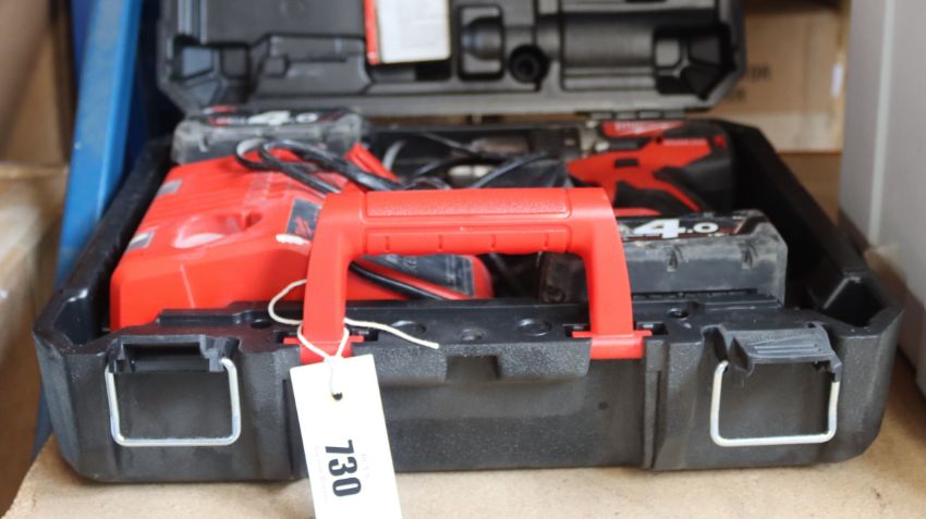 A pre-owned Milwaukee Cordless Hammer Drill (M18 CBLPD-402C) with batteries, charger and case.