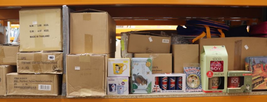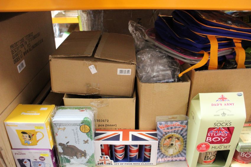 Assorted as new British film/TV novelties to include mugs, coasters and bags from franchises such as Dads Army, Disney and Wallace and Gromit.