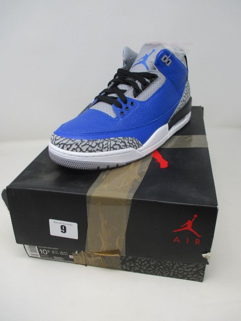 A pair of as new Nike Air Jordan 3 Retro in varsity blue (UK 9.5 - Damaged box).