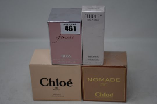 An as new Chloe eau de parfum (50ml), an as new Chloe Absolu de parfum (30ml), an as new Hugo Boss Femme eau de parfum (75ml) and an Eternity for women eau de parfum (30ml).