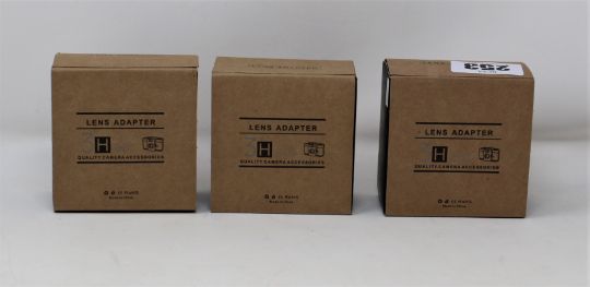 Three boxed as new Fikaz Lens Adaptors; 1 x Nikon to Canon EOS R, 1 x Canon EOS to Nikon Z, 1 x Canon EOS to Canon EOSR.