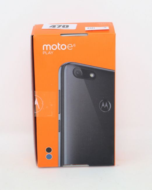 A boxed as new Motorola E6 Play XT2029-2 32GB Dual Sim Smartphone in Steel Black (Box sealed. UK plug adaptor required).
