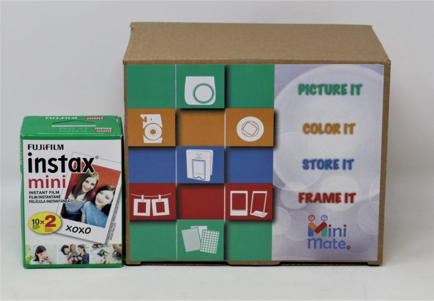 A boxed as new Fujifilm Instax Mini 9 Instant Camera in Smoky White, two twenty sheet packs of Instax Mini color film (Best before: 2022-03) and a Minimate Instax Mini 9 Accessory Bundle including case, frames, filters and other items.