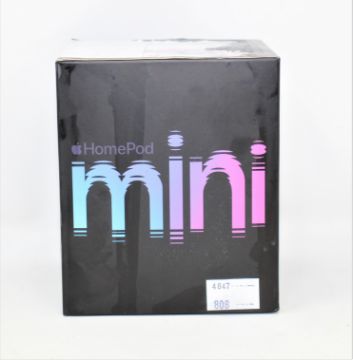 A pre-owned Apple HomePod mini in Space Gray (M/N: A2374) (Boxed, UK plug included. Factory reset) (Damaged box).