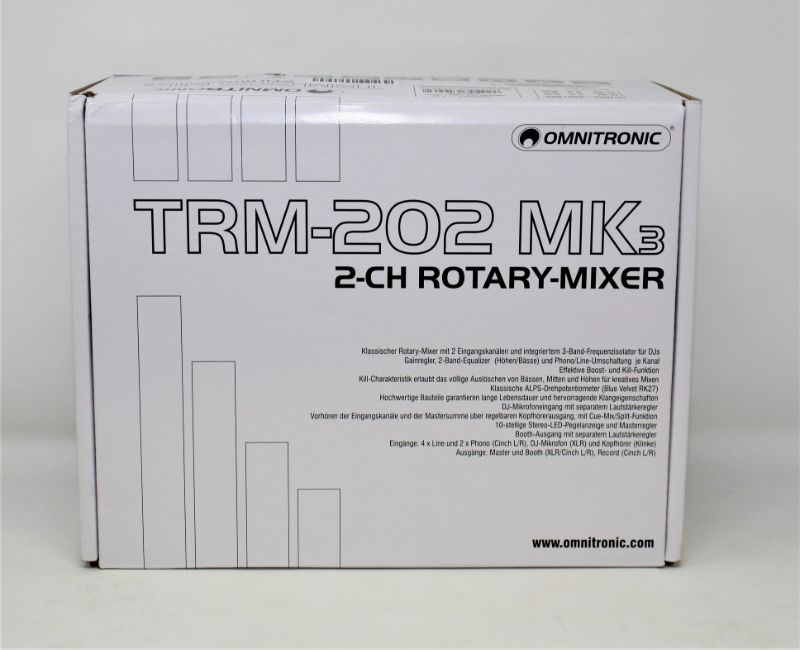 A boxed as new Omnitronic TRM-202 MK3 2-Channel Rotary DJ Mixer (Box opened, some superficial damage to box) (UK plug adaptor required).