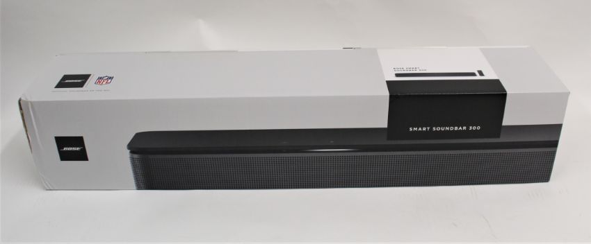 A boxed as new Bose Smart Sound Bar 300 with Google Assistant & Amazon Alexa in Black (P/N: 843299-4100 230V UK) (Box sealed, some damage to box).