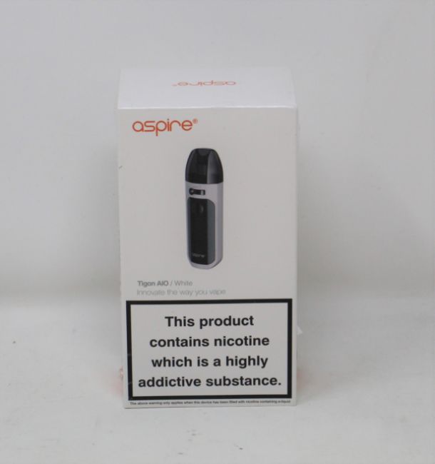 Five boxed as new Aspire Tigon AIO Pod Vape Kits in White (Boxes sealed) (Over 18's only).