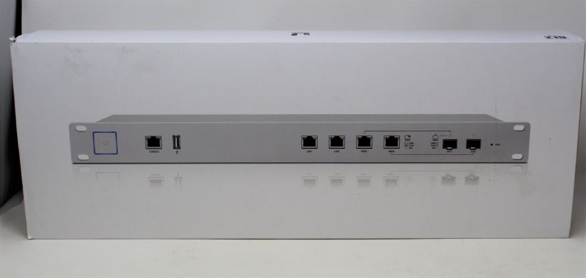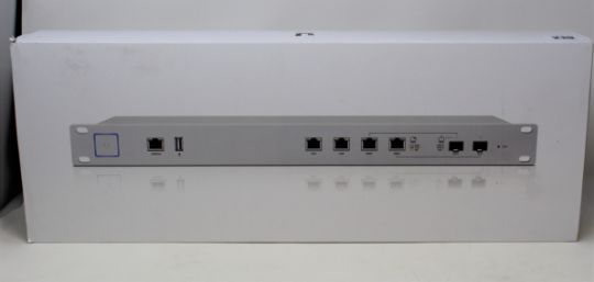 A boxed as new Ubiquiti UniFi Security Gateway Pro Enterprise Gateway Router with 2 Combination SFP/RJ45 Ports (M/N: USG-PRO-4 EU) (Some superficial damage to box. UK plug adaptor required).
