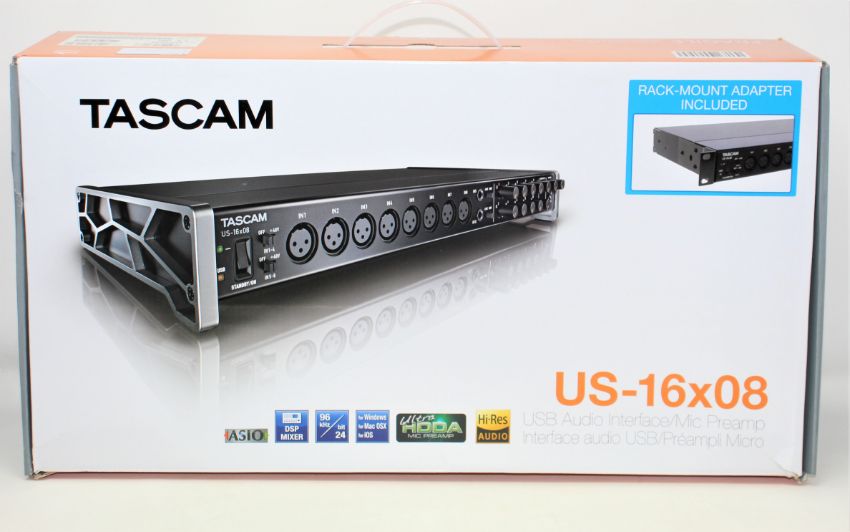 A boxed as new TASCAM US-16X08 Rack Mountable 16x8 Channel USB Audio Interface / Mic Preamp (Box opened, some superficial damage to box) (UK plug adaptor required).