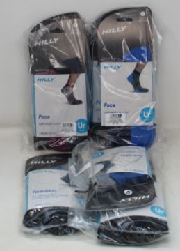 A quantity of Hilly sports socks in Pace Unisex Quarter/Women's Socklet and TwinSkin Unisex Anklet (S, M, L, approximately 45 pairs).