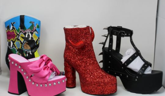 A pair of Sugar Thrillz Strike a Pose Bow mule heel shoes in pink (US 11M), Dolls Kill date The Devil glitter boots (US 11), Cape Robbin Down To Party heeled boots (US 11) and fan All the Flames Predator shoes (UK 9).