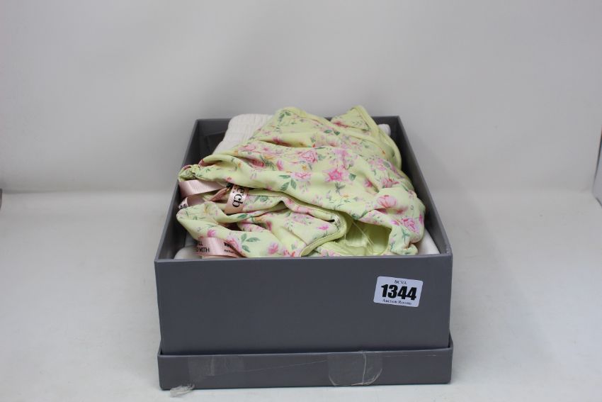 Three items of as new House of CB London clothing; a Tommy off white oversized crew neck sweatshirt (L - RRP £59), a pair of Auden off white jersey shorts (S - RRP £49) and a Vivienne lemon floral corset (S - RRP £79).