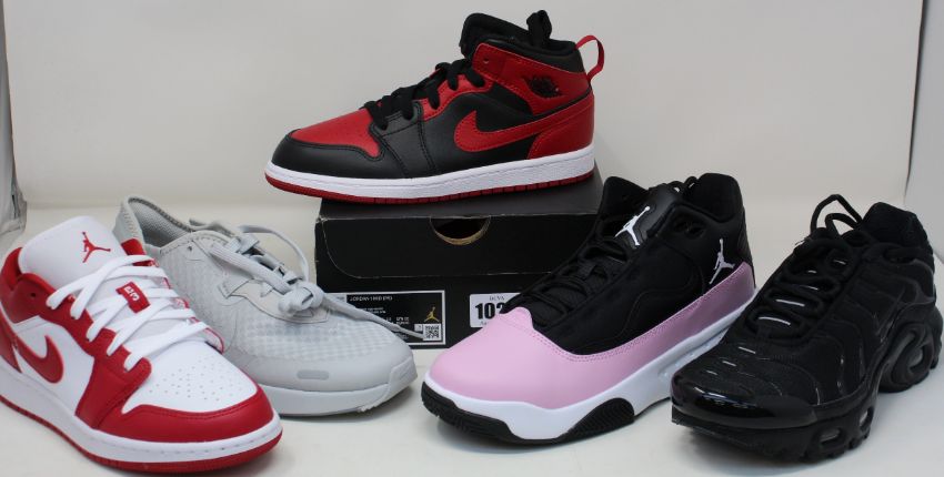 Five pairs of youths as new Nike trainers; Reposto (UK 5), Jordan Max Aura 2 (UK 5.5), Air Max Plus (UK 4.5), Jordan 1 Mid (UK 2.5) and Air Jordan 1 Low (UK 3.5).