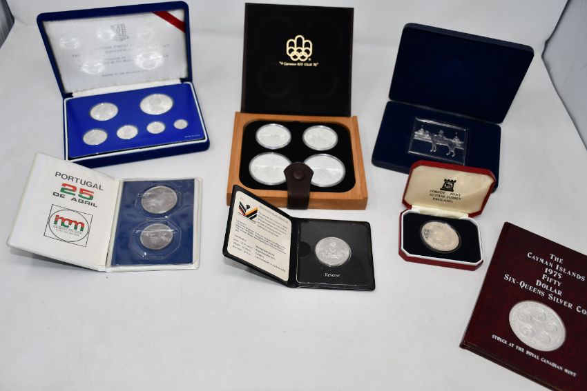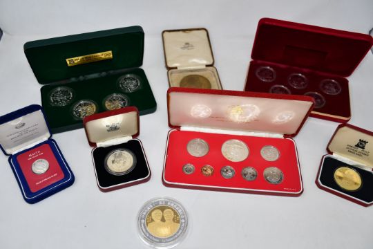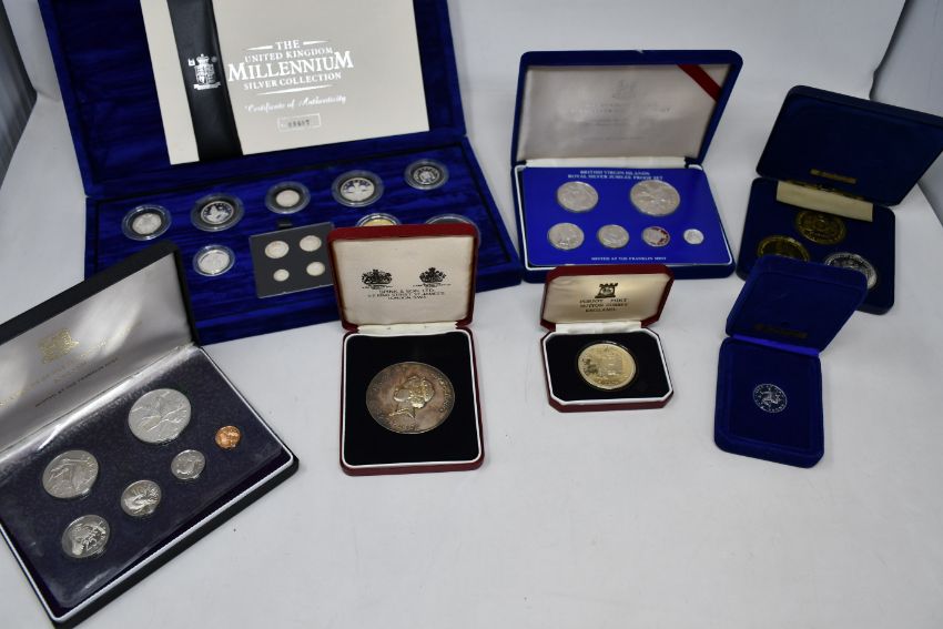 A box of coins to include large quantity of mostly sterling silver commemorative proof coins, years set, etc.