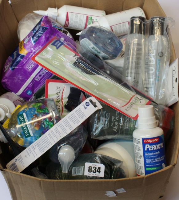 Two boxes of assorted as new toiletries/beauty products and related items.