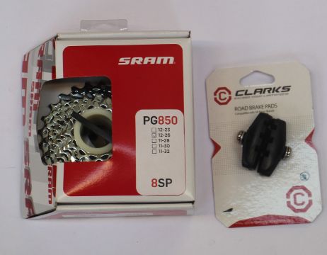 Two as new SRAM PG-950 9 Speed Cassettes 11-32, one as new SRAM PG-950 9 Speed Cassette 11-34 and one as new SRAM PG-850 8 Speed Cassette 12-26 together with twenty as new Clarks Road Brake Pads.