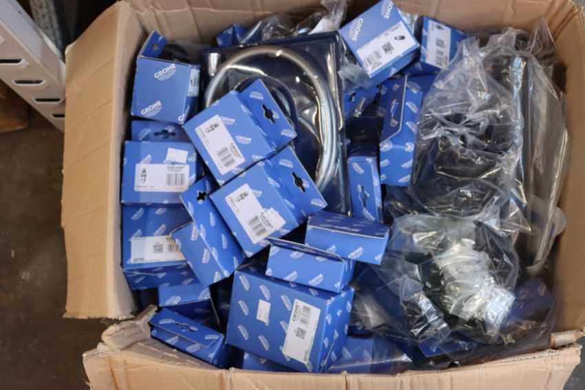 One box containing a large quantity of boxed as new GROHE pluming accessories to include Thermostatic Cartridges (47450000), Eau2 Pneumatic Dual Flush Air Button Assemblies (42357PI0) and Relexa Shower Outlet Elbows (28628000) (Approximately 80 items).