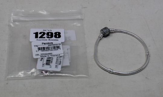 An as new Pandora moments sparkling pave clasp snake chain bracelet (590723CZ-19), an as new Pandora knotted hearts ring (198018-48) and an as new micro dangle charm (798981C01).