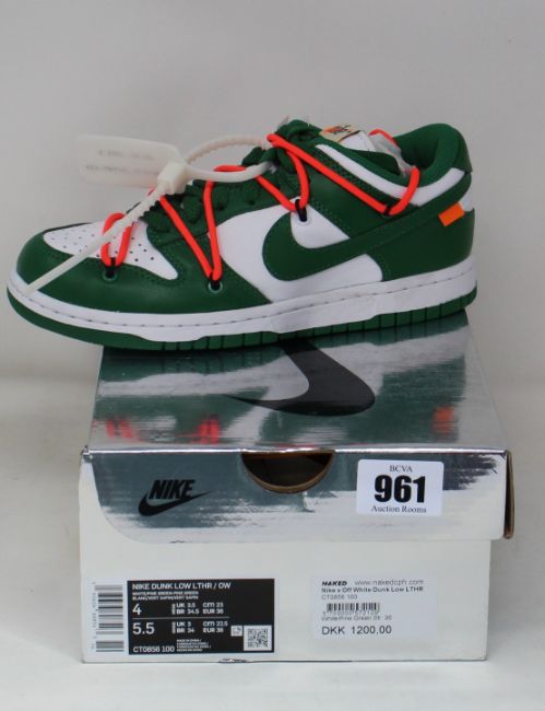 A pair of as new Nike X The Off-White Dunk low Pine Green trainers (UK 3.5).