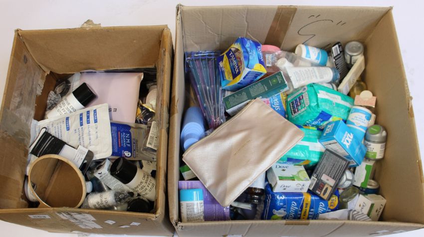 Two boxes of assorted as new/part used toiletries and beauty items.