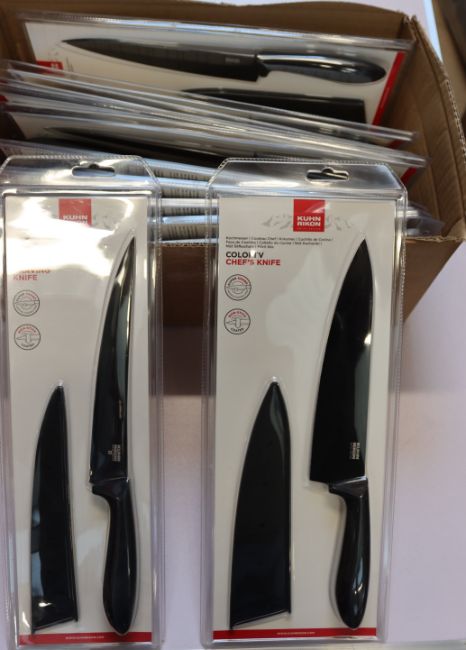 Twelve as new Kuhn Rikon knives to include six Colori V chef's knives, four Colori V carving knives and two Colori V bread knives (Over 18s only).