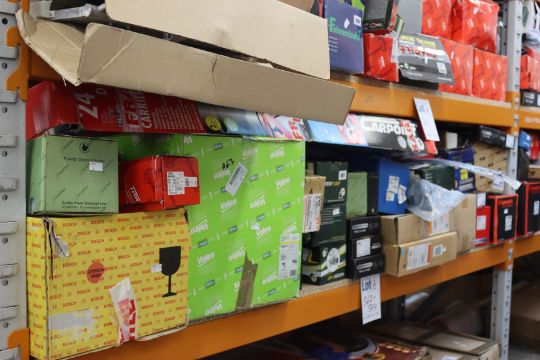A shelf of assorted car parts to include coil springs, alternators, water pumps, brake discs, timing chain kits, starter motors, headlights and roof bars.