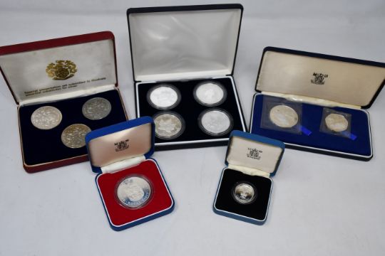 A box of coin collections to include many silver proof coins, plus old silver coins, uncirculated base metal, etc.