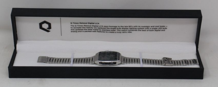 An as new Q Timex Reissue Digital LCA 32.5mm stainless steel bracelet watch in case.