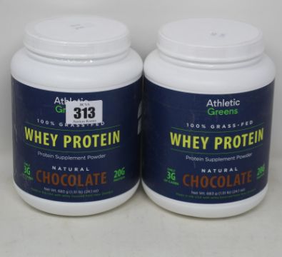 Four Athletic Greens 100% Grass-Fed Whey Protein Supplement Powder (683g) in natural chocolate flavour (Exp: 09/22).