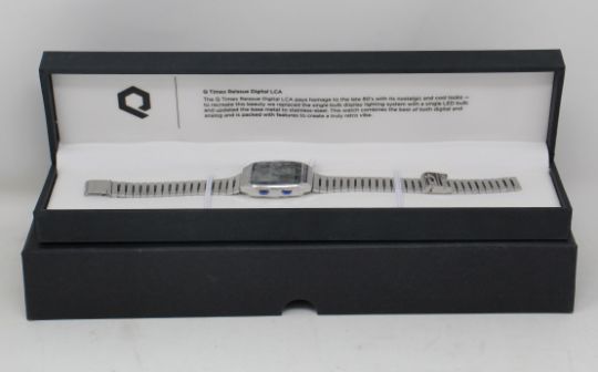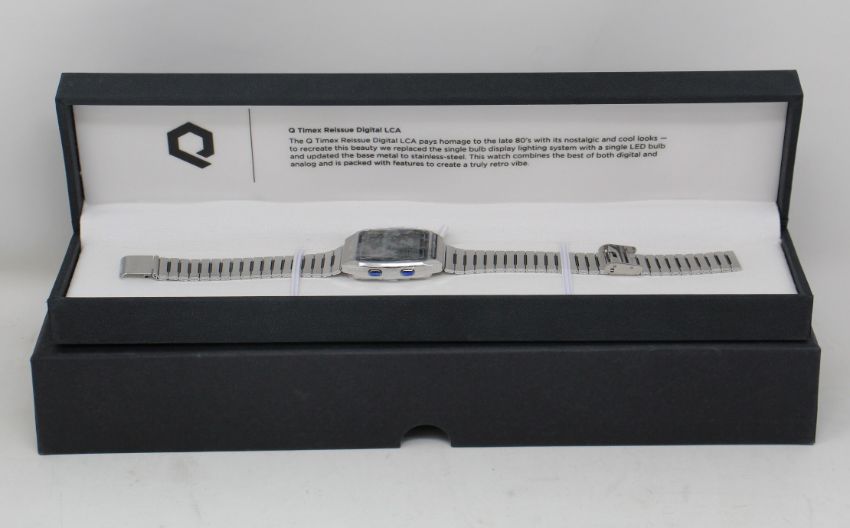 An as new Q Timex Reissue Digital LCA 32.5mm stainless steel bracelet watch in case.