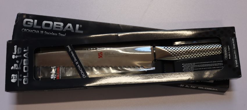 A boxed as new Global Cromova 18 stainless steel G-9 bread knife with 22cm blade (Over 18s only).