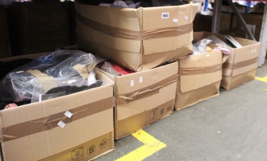 Five boxes of as new clothing and related items.