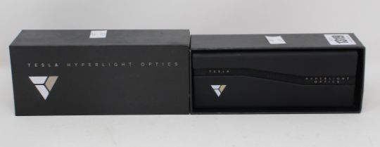 A pair of as new brown Tortoiseshell Tesla hyperlight optics glasses with case (Damage to outer box).