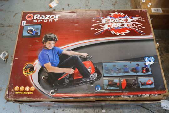 A boxed as new Razor Sport crazy cart electric drift cart in red (Boxed damaged and damp).