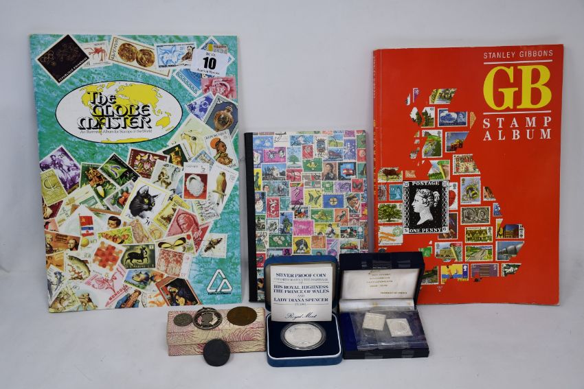 Coin and stamp collection including two silver proof crowns, twelve France 5f silver, plus others.