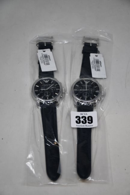Two men's as new Emporio Armani AR0431 classic black watches (No boxes included).