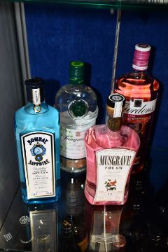 A bottle of Bombay Sapphire London gin (1ltr), a Tanqueray limited edition Lovage London dry gin (1ltr), a Gordans premium pink gin (1ltr) and a Musgrave pink gin infused with rose water (750ml) (Over 18s only).