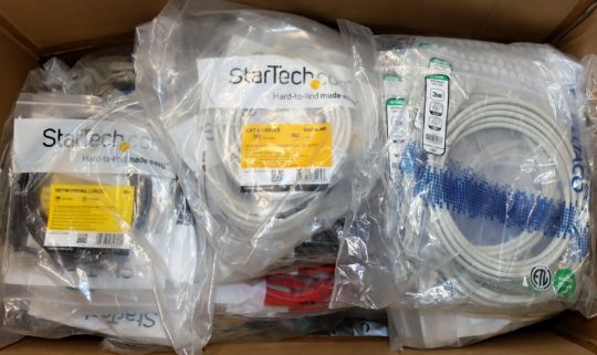 A box of assorted as new networking cables.